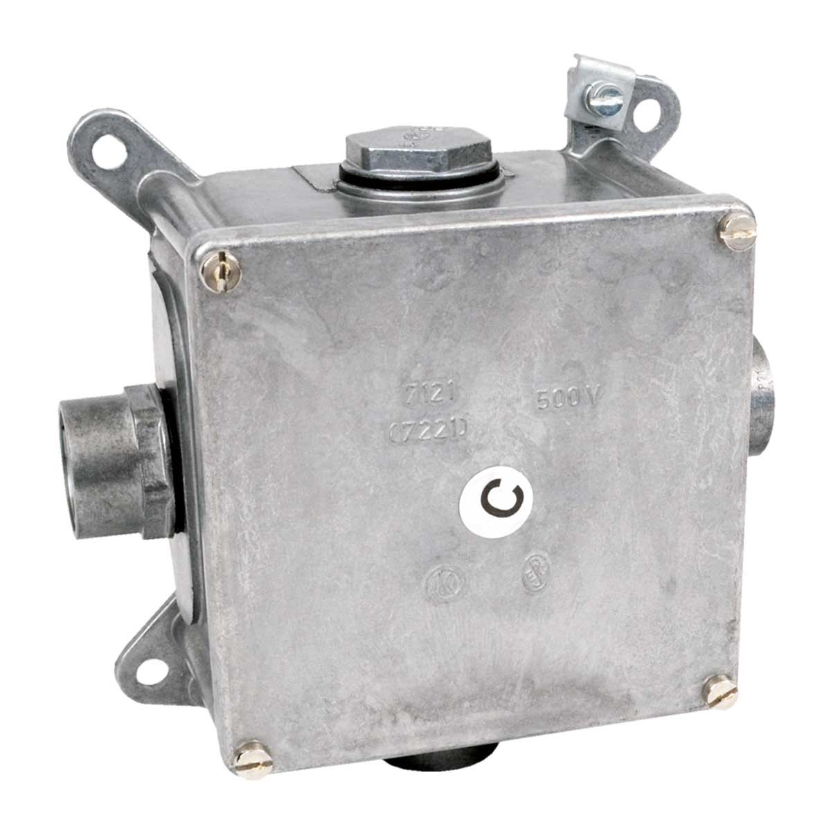 Коробки для примениния вместе со стальными трубами с резбой и стальными гибкими трубами. Три втулки и одна загушка входят в комплект и установлены на коробке. Клеммник не входит в комплект. 7121 B: с клеммой для сетей TNS. 7121 C: без клеммы для сетей TNC.