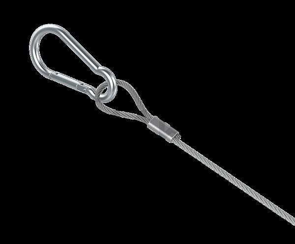 Трос с карабином и замком применяется для крепления кабельных линий как защищенных, так и незащищенных металлической оболочкой, открытого типа в подвешенном положении. Трос с карабином и замком применяется в помещениях всех видов для закрепления кабельных лотков. Трос стальной, изготовлен методом двойной завивки. Для фиксации тросов применяют замки. Для непосредственного крепления к несущим конструкциям применяются болты, анкера, карабины, шурупы, крюки, которые идут в комплекте.