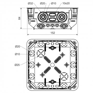 Большое количество вводов для установки кабелей и труб. Можно установить несущую рейку TS 35. Пазы в углах коробки дают возможность выровнить крышку. Для облегчения манипуляций с проводами можно удалить всю боковую стенку коробки. С наружной стороны днища отмечены места для просверливания отверстий. Монтажные винты имеют трёхшаговую резьбу для быстрого монтажа. Степень защиты IP30 достигается комплектностью поставки коробки с крышкой.