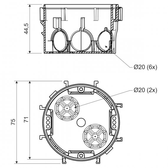 Коробка установочная для твердых стен KP 67 / 3 (KA) с межосевым расстоянием 71 мм, D70х45 мм