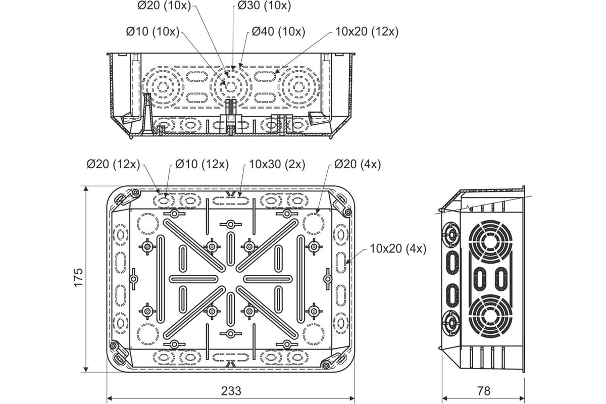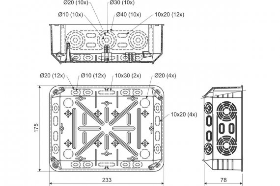 Распределительная коробка KOPOS для твердых стен скрытого монтажа 233х175х78 мм KT 250/1_KB имеет большое количество вводов для установки кабелей и труб. Можно установить несущую рейку TS 35 и эквипотенциальный клеммник. Пазы в углах коробки дают возможность выровнить крышку. Для облегчения манипуляций с проводами можно удалить всю боковую стенку коробки.
