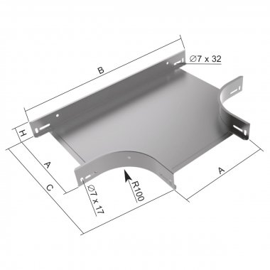 Отвод Т-образный предназначен для организации Т- или Х-образного горизонтального отвода кабельной трассы. Также аксессуар применяется для Т-ответвления вниз в вертикальной плоскости без применения крышки. Крышка аксессуара в комплект не входит.