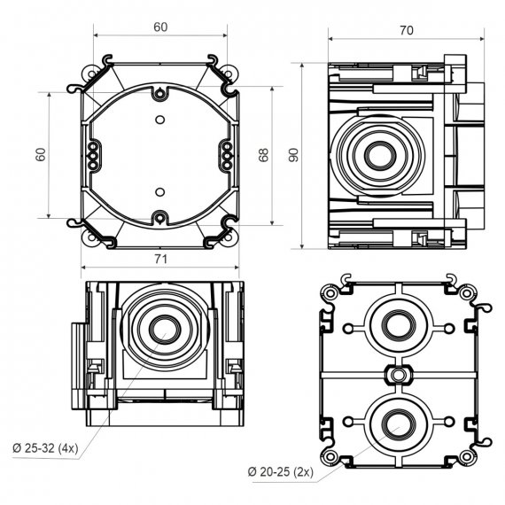 Приборная коробка для литого бетона - глубина установки 70 мм. Крышка коробки приспособлена для прибивания или привинчивания винтов к деревянной опалубке. Возможность фиксации крышки коробки с помощью термоплавкого клея-пистолета. Герметичное соединение крышки с коробкой. Входы для труб, снабженных герметизирующей мембраной, против попадания бетонной смеси. Возможность фиксированного соединения коробов на осевое расстояние 71 мм и 90 мм. Возможность фиксации короба на якоре с помощью крепежных крыльев СБ-МК 1 (в комплект поставки не входит). Возможность использования коробки для двусторонней сборки - взаимная фиксация с помощью стальных стержней 6 мм КБП-8 (в комплект не входит).