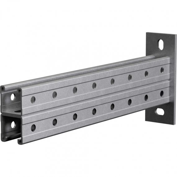 Страт-консоль двойная используется как несущий элемент для прокладки кабельных трасс и инженерных сетей, в том числе и в системе промышленного интегрированного фальшпола. Изделие выполнено из стали и оцинковано по методу Сендзимира. Предназначено для применения в местах предпочтительно с сухим климатом, внутри помещений и в слабоагрессивных средах, в соответствии с ГОСТ15150-69. Элемент позволяет создавать опорные конструкции с высокой несущей способностью, без применения сварочных работ, при помощи специальных канальных гаек.